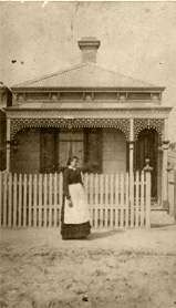 Lucy had a younger brother Patrick Cleary who was born c1881. A photograph of Maria Cleary with her two children suggests there is less than three years difference between the ages of Patrick and Lucy, and that 1883 is the more likely birth date. Peter and Maria also had a foster child Tom Hughes. The Cleary family lived in Victoria. In 1904, and on Lucy's 21st birthday they had lived in 81 Haglan Street Port Melbourne. Peter's occupation was a labourer. ![]() Maria Cleary and the Cleary residence, Melbourne |